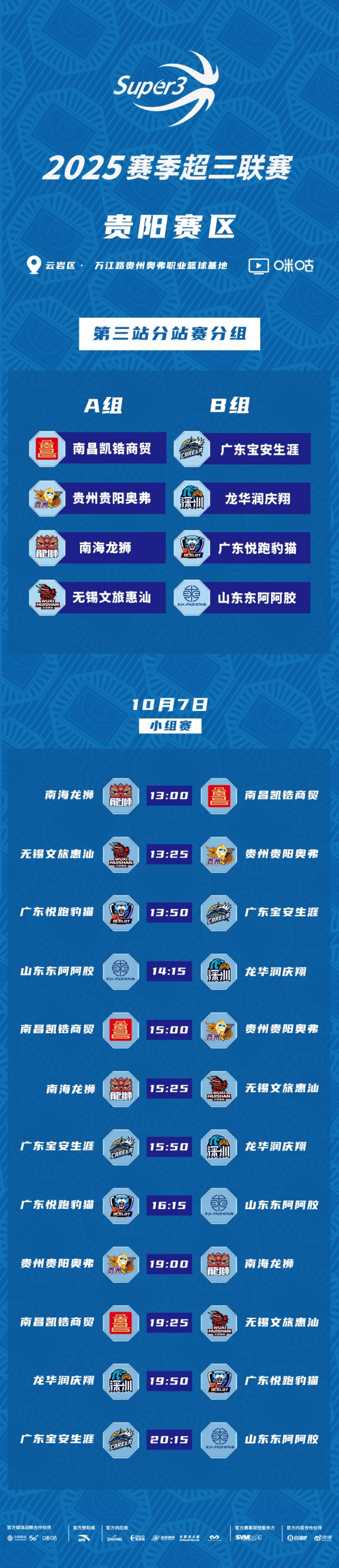 贵阳赛区第三站比赛时间:10月7日播报~10月8日比赛地点:云岩区· 万江路贵州奥弗职业篮球基地直播平台:咪咕视频app贵阳赛区第三站分组及赛程购票链接及赛场交通指南扫码赢好礼扫描二维码填写超三联赛观赛体验调查问卷,参与调研的球迷朋友将有机会获得超三联赛精美礼品,发放形式为邮寄。咪咕直播二维码