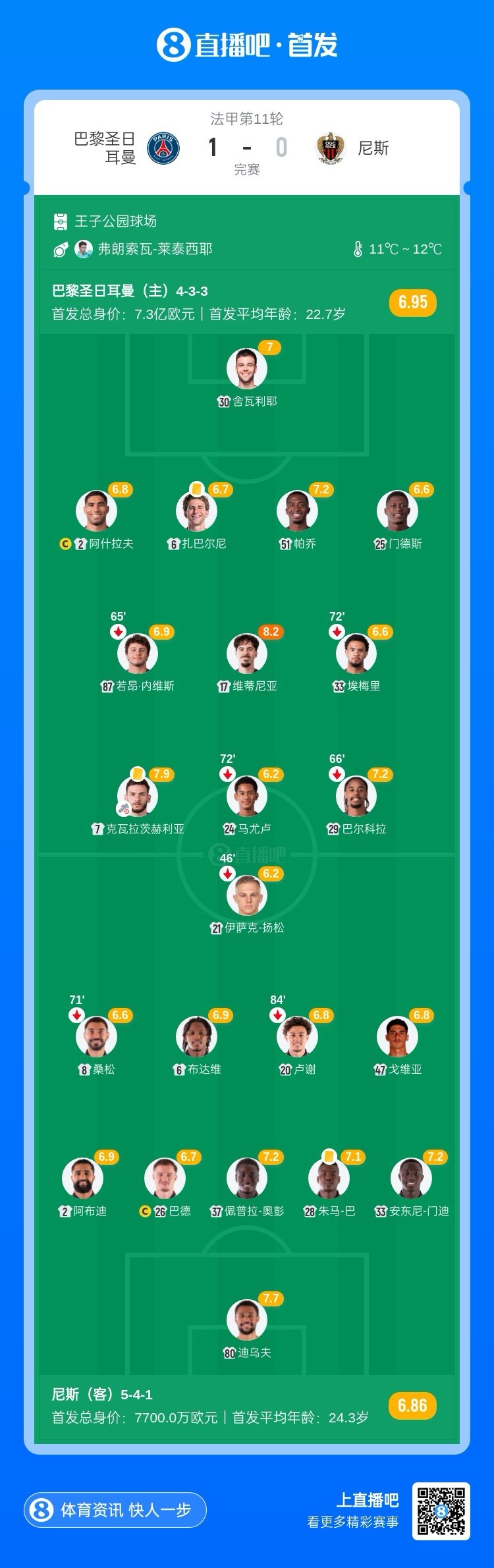 足球日报11月2日播报讯 北京时间11月2日凌晨,法甲第11轮,巴黎坐镇王子公园球场对阵尼斯。上半场双方均无建树,巴尔科拉错失破门良机。巴黎半场0-0战平尼斯。下半场,贡萨洛-拉莫斯补时完成绝杀。最终巴黎1-0击败尼斯。